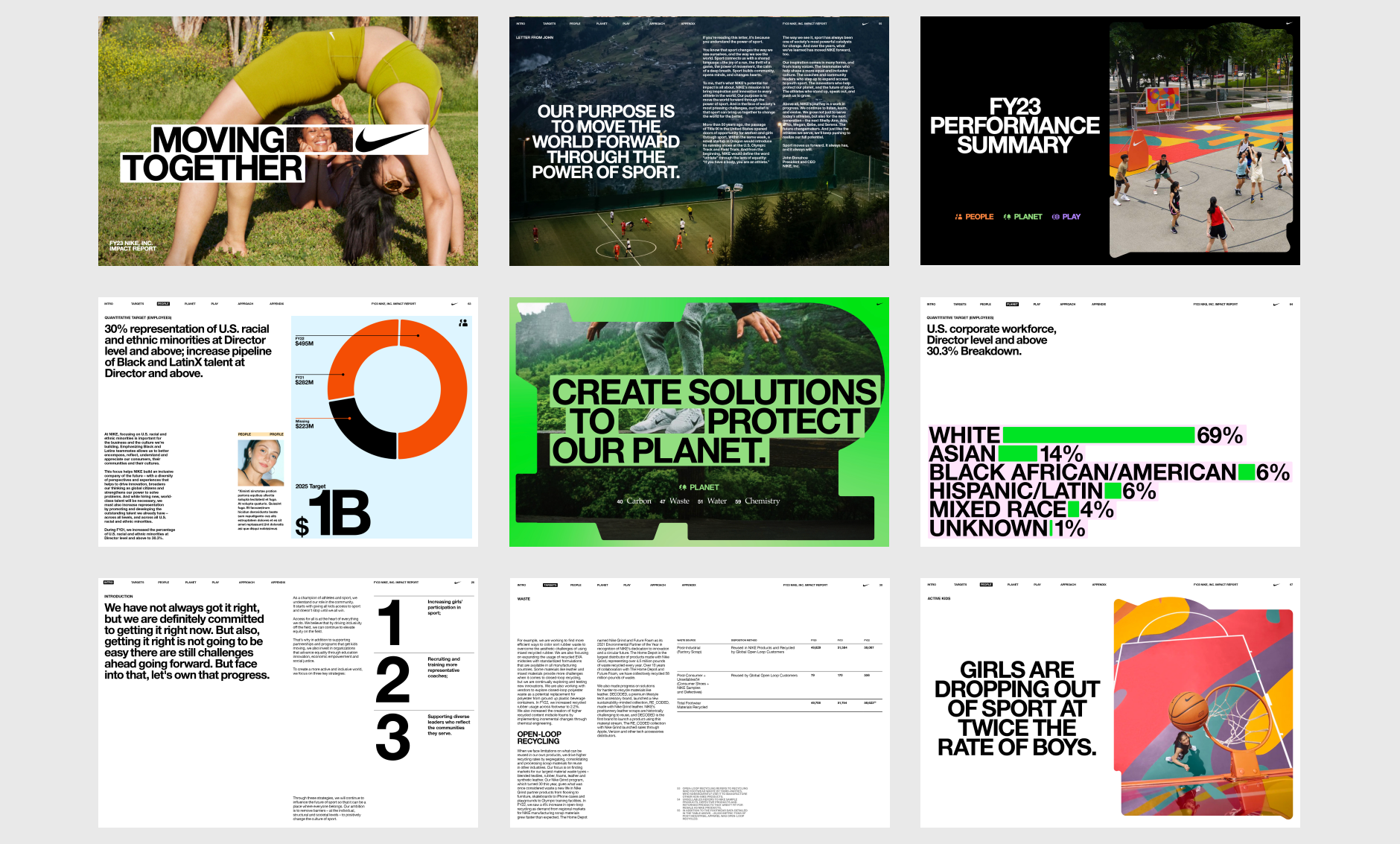 Developed a distinctive interpretation of Nike’s holistic concept, "Reimagining Victory," for an FY23 Impact Report. This interpretation emphasise three core sectors: People, Planet, and Play. Each sector is represented through a unique typographic frame, serving as a clear and focused vision for Nike's impact in these areas.