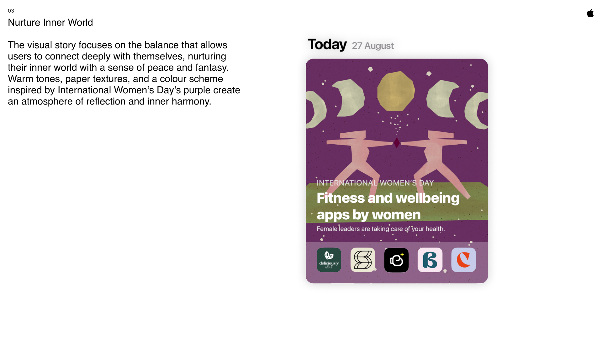For International Women’s Day, this project reimagines the visual thumnail of Today’s App on the Apple App Store. The featured apps support users across diverse aspects of health and well-being—ranging from recipes and workouts to mindfulness and hormonal cycles. The concept visualises the multifaceted narratives of women, amplifying their voices while inviting a broader audience to engage with their stories.